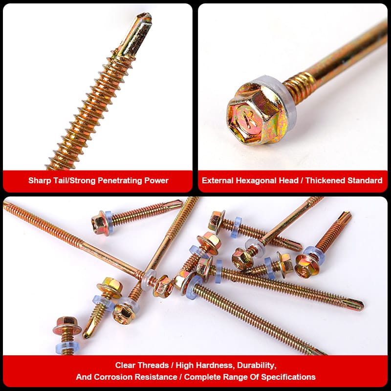 These continuous-fire hexagonal self-drilling screws are made of carbon steel with zinc coating, featuring high hardness, self-drilling penetration, and an anti-slip hexagonal head for efficient installation.